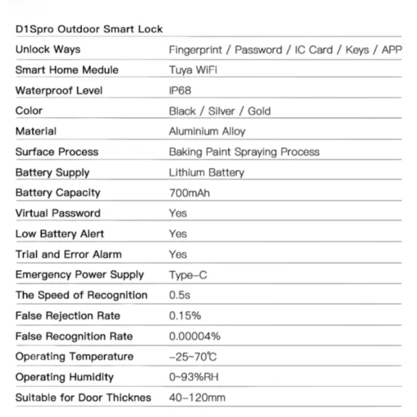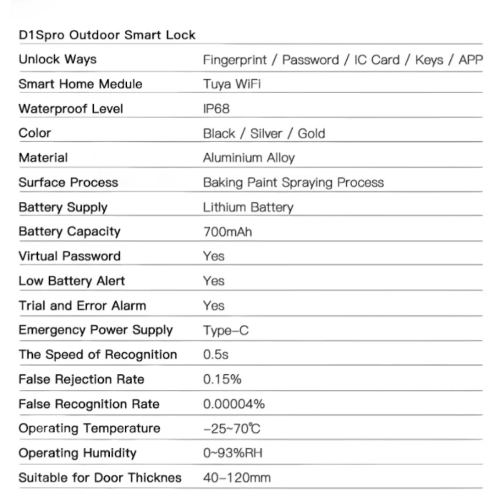 This comprehensive setup makes the D1s Pro double keypad door lock a reliable and future-proof security solution for outdoor environments. It combines the intelligence of smart access with the practicality of robust outdoor hardware, delivering convenience, security, and control in one integrated device.